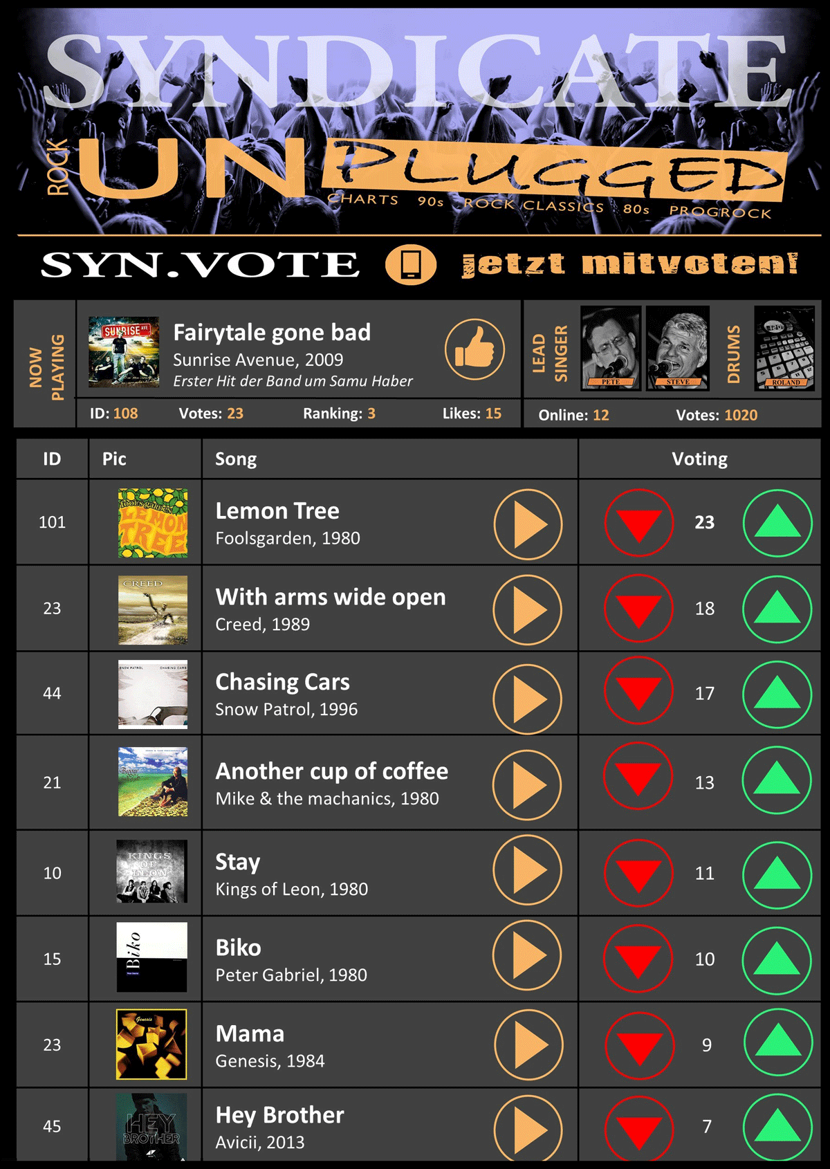 Die ständig aktualisierte Playlist ist Syndicates Reminiszenz an die wohl kreativste Schaffensperiode der Musikgeschichte. Mit SynVote hat das Publikum jederzeit die Möglichkeit seine Lieblingssongs nach oben auf die Playlist zu voten und so den Ablauf des Konzerts direkt zu bestimmen. Wer die Songs aus der Syndicate Playlist nicht kennt, der hat nie Musik gehört :-)